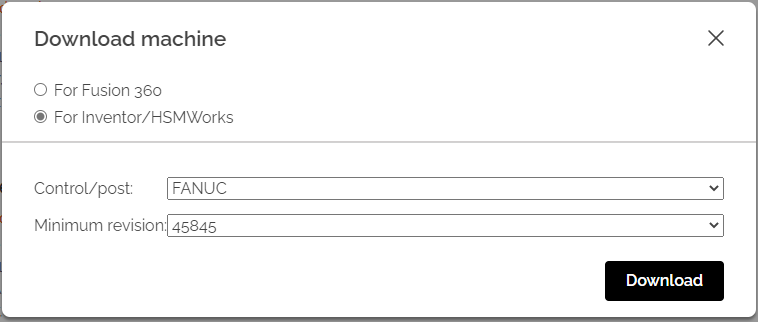 Machines in the new format (.mch) can be directly used by Fusion only. Inventor CAM and HSMWorks cannot consume them directly. However, it is still possible to use new machines for configuring universal posts, which are designed to work with external machine configurations. For this purpose machines in new format can be downloaded as a single package (.cpsz) with any post. This packaged post can then be selected for postprocessing instead of a regular post. You cannot use a separate machine for posting with this post, as it contains embedded machine already.